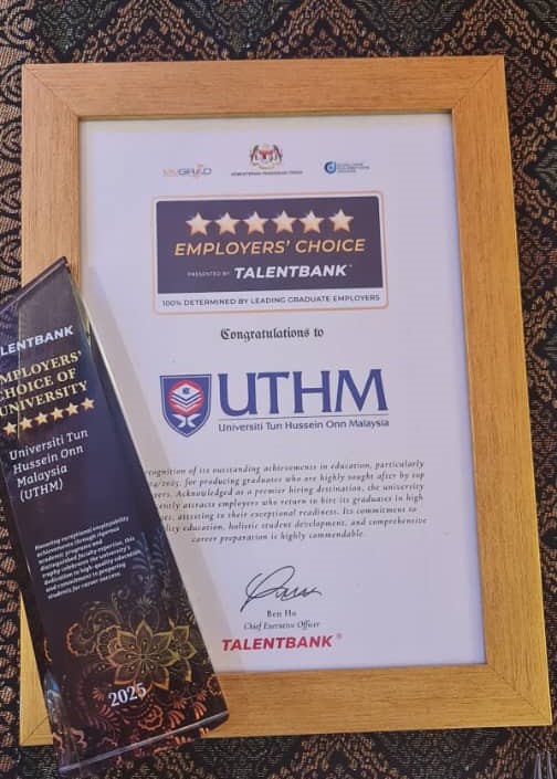 Universiti Tun Hussein Onn Malaysia (UTHM) once again has been crowned as the Employers’ Choice of University 2025, by Talentbank based on the national graduate employability (GE) index. The index is based on the comprehensive survey conducted to more than 50 renowned companies assessment including Maybank, CelcomDigi, PETRONAS, Public Bank and many more. UTHM has consistently produced graduates with high quality that is aligned with the needs of the industries and possess high adaptability.