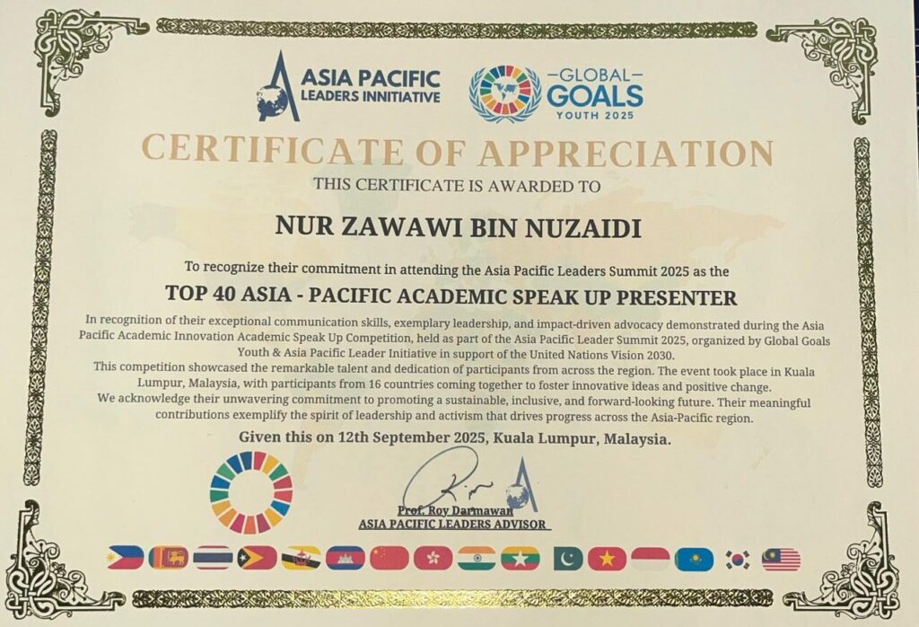 Universiti Tun Hussein Onn Malaysia (UTHM) is honoured by the achievement of Nur Zawawi Nurzaidi of Faculty of Applied Sciences and Technology, for being selected to represent Malaysia at the Asia-Pacific Leaders Summit (APLS)2025. He shone among 3,000 applicants to be joining 35 selected delegations for the summit. On top of that, he also the proud winner of Top 40 Asia-Pacific Academic Speak Up Presenter award.