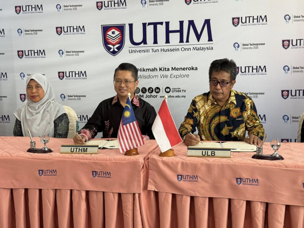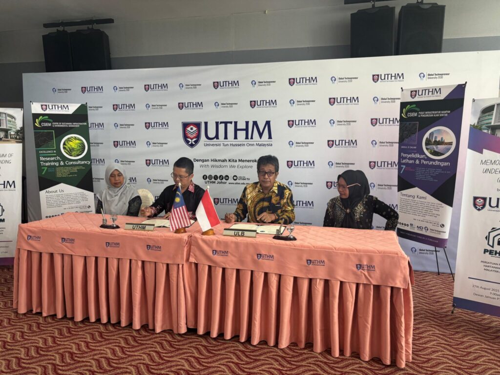 Universiti Tun Hussein Onn Malaysia (UTHM) and Universitas Labuhanbatu (ULB), Indonesia is set to collaborate in academic publication, collaborative research, communal and environmental development as well as staff and students’ mobility programme via the signing of Memorandum of Understanding (MoU) at the Tunku Tun Aminah Library (PTTA), UTHM recently. This strategic collaboration plan is the initiative by Faculty of Technology Management and Business, coordinated by Centre of Sustainable Infrastructure and Environmental Management (CSIEM).