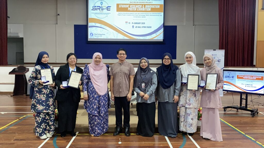 The closing ceremony of SRIPE 2026 was officiated by the Dean of FAST, Associate Professor Ts. Dr. Noor Azura Binti Awang, who also presented awards to the winners. For the Bachelor of Science in Food Technology (BWD), the gold medal was awarded to Theventhira Rau Anandan, followed by the silver medal for Nur Mardhiah Musfirah Binti Aminudin and the bronze medal for Nur Afiqah Binti Zulkpli, while Nur Ain Sofea Binti Mohd Efandi received the Industry Choice Award. Meanwhile, for the Bachelor of Science in Biodiversity and Conservation (BWW), Yeoh Jing was awarded the gold medal, followed by Nuraisyah Farhana Binti Ab Hadi (silver) and Mumtaz Murfiqah Binti Mazdi (bronze), while Aliyah Adriana Binti Mohammad received the Industry Choice Award.