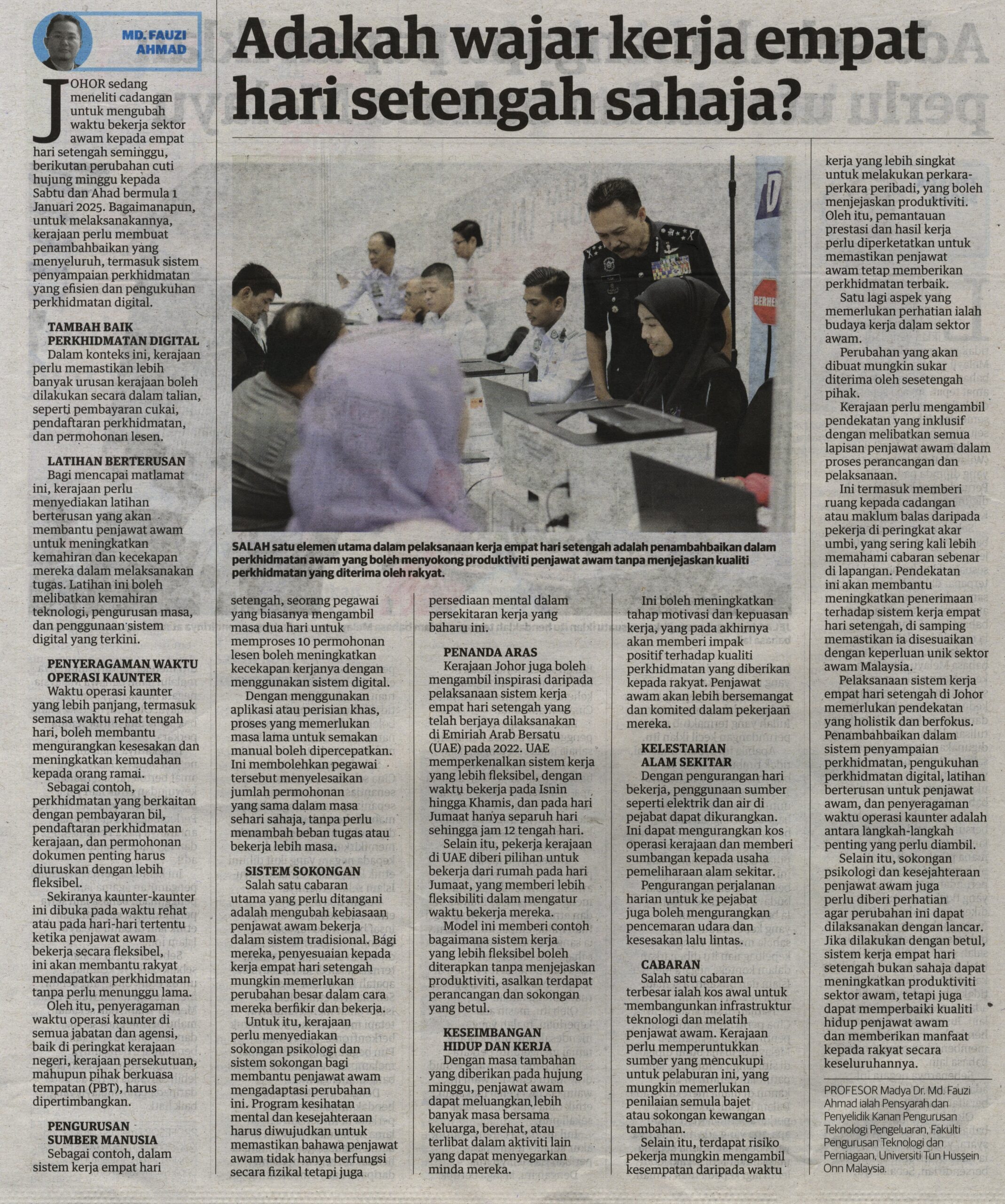 UTUSAN MALAYSIA 26 NOVEMBER 2024 (02383) PROF. MADYA Ts. DR. MD FAUZI BIN AHMAD @ MOHAMAD (FPTP) Adakah wajar kerja empat hari setengah sahaja