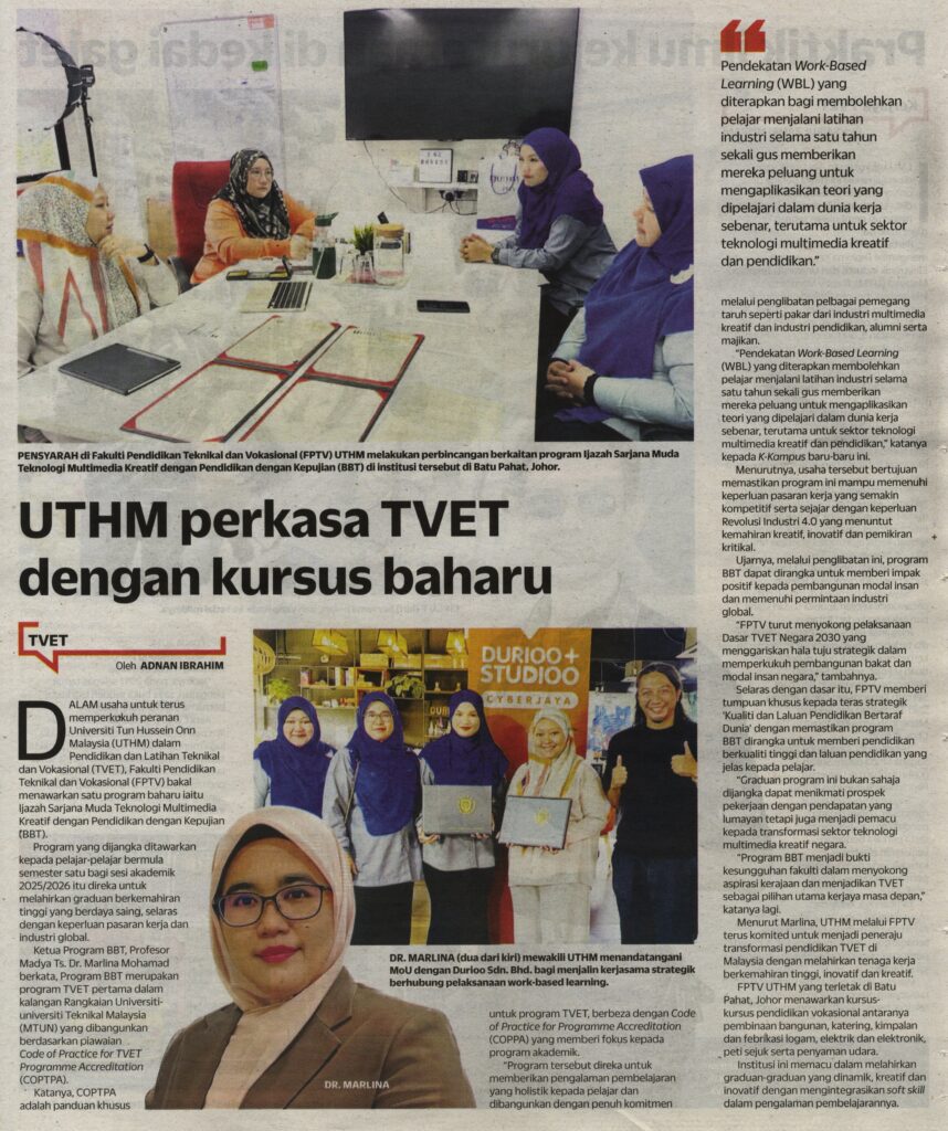 BATU PAHAT – Fakulti Pendidikan Teknikal dan Vokasional (FPTV), Universiti Tun Hussein Onn Malaysia (UTHM) terus memperkukuh peranannya dalam Pendidikan dan Latihan Teknikal dan Vokasional (TVET) dengan menawarkan program baharu iaitu Ijazah Sarjana Muda Teknologi Multimedia Kreatif dengan Pendidikan dengan Kepujian (BBT).