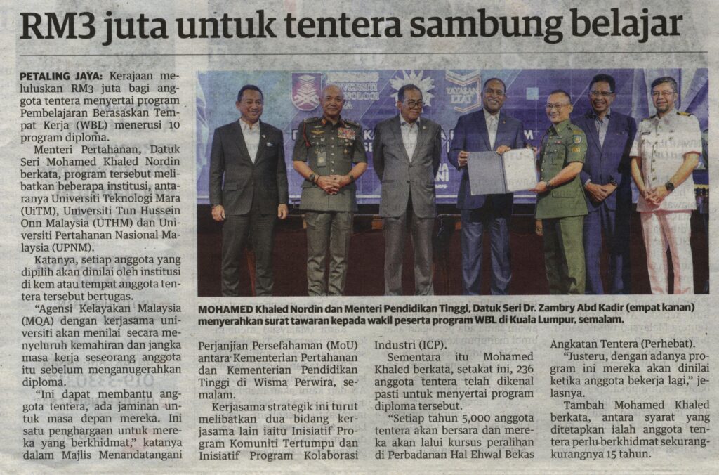 6. Utusan Malaysia (muka surat: 4): RM3 juta untuk tentera sambung belajar