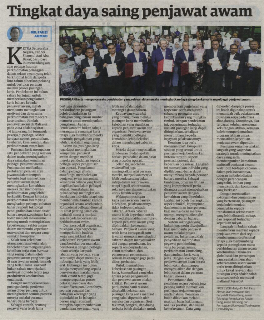 2. Utusan (utusan.com.my): Tingkat daya saing penjawat awam oleh Prof. Madya Ts. Dr. Md Fauzi Ahmad @ Mohamad, Fakulti Pengurusan Teknologi dan Pengurusan (FPTP), UTHM
