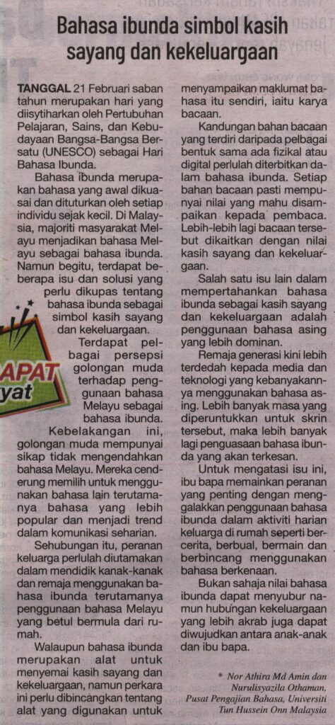 1. Sinar Harian (muka surat: 20), 18 Februari 2025: Bahasa ibunda simbol kasih sayang dan kekeluargaan