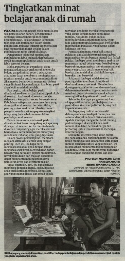 2. Utusan (utusan.com.my): Tingkatkan minat belajar anak di rumah oleh Prof. Madya Dr. Ezrin Hani Sukadarin, Fakulti Teknologi Kejuruteraan (FTK), UTHM dan Dr Junaidah Zakaria, Fakulti Sains dan Teknologi Industri, UMPSA