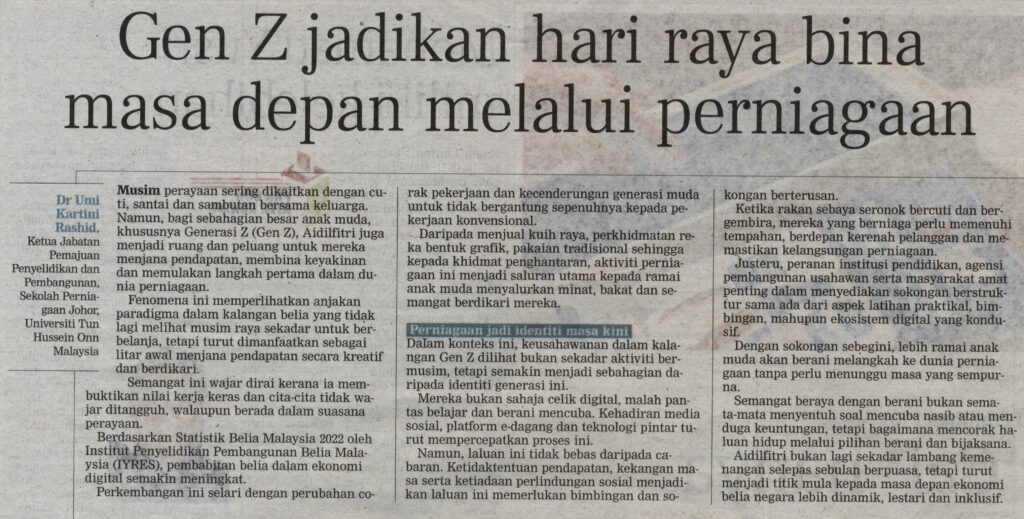 1. Berita Harian (muka surat: 13), 9 April 2025: Gen Z jadikan hari raya bina masa depan melalui perniagaan