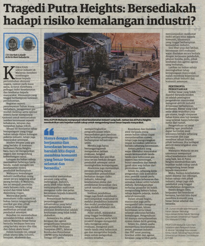 2. Utusan (utusan.com.my): Tragedi Putra Heights: Bersediakah hadapi risiko kemalangan industri? oleh Dr. Zuritah A. Kadir dan Prof. Madya Dr. Ezrin Hani Sukadarin, Fakulti Teknologi Kejuruteraan (FTK), UTHM