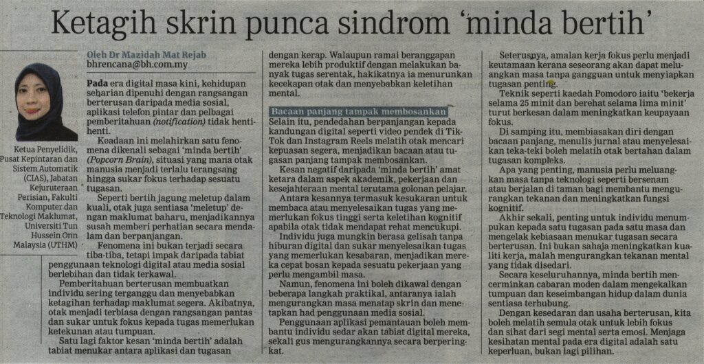 2. Berita Harian (bharian.com.my): Ketagih skrin punca sindrom `minda bertih’ oleh Ts. Dr. Mazidah Mat Rejab, Fakulti Sains Komputer dan Teknologi Maklumat (FSKTM), UTHM