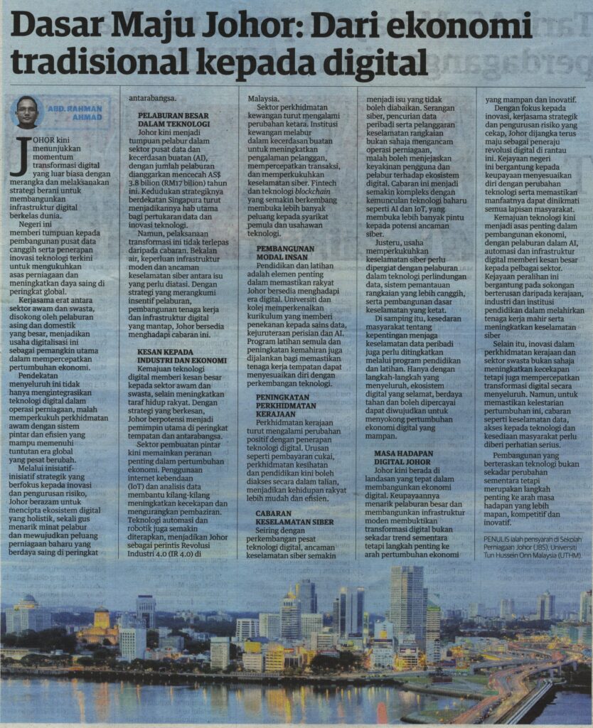 2. Utusan (utusan.com.my): Dasar Maju Johor: Dari ekonomi tradisional kepada digital oleh Prof. Dr. Abd. Rahman Ahmad, Dekan Johor Business School (JBS), UTHM
