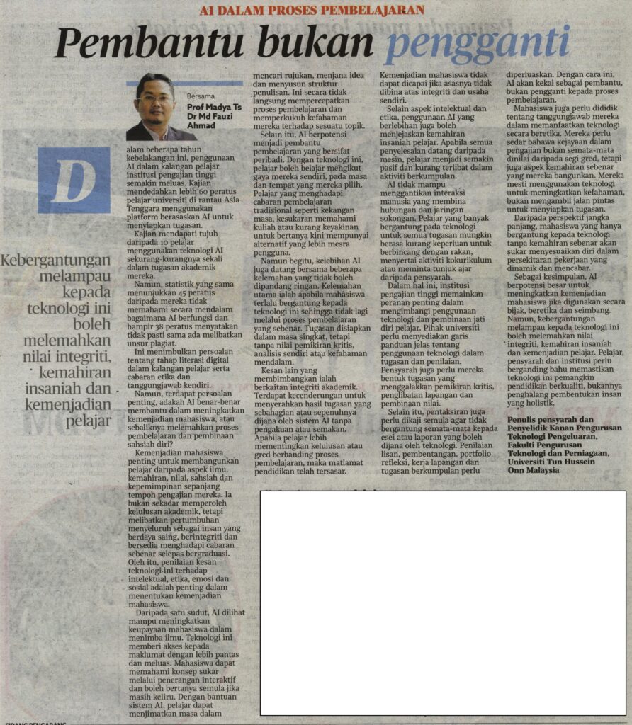 Selain itu, pentaksiran juga perlu dikaji semula agar tidak bergantung semata-mata kepada esei atau laporan yang boleh dijana oleh teknologi. Penilaian lisan, pembentangan, portfolio refleksi, kerja lapangan dan tugasan berkumpulan perlu diperluaskan. Kaedah ini dapat mendorong pelajar untuk lebih aktif, berinteraksi dan menunjukkan hasil kerja berdasarkan pengalaman dan usaha mereka sendiri. Dengan cara ini, AI akan kekal sebagai pembantu, bukan pengganti kepada proses pembelajaran.