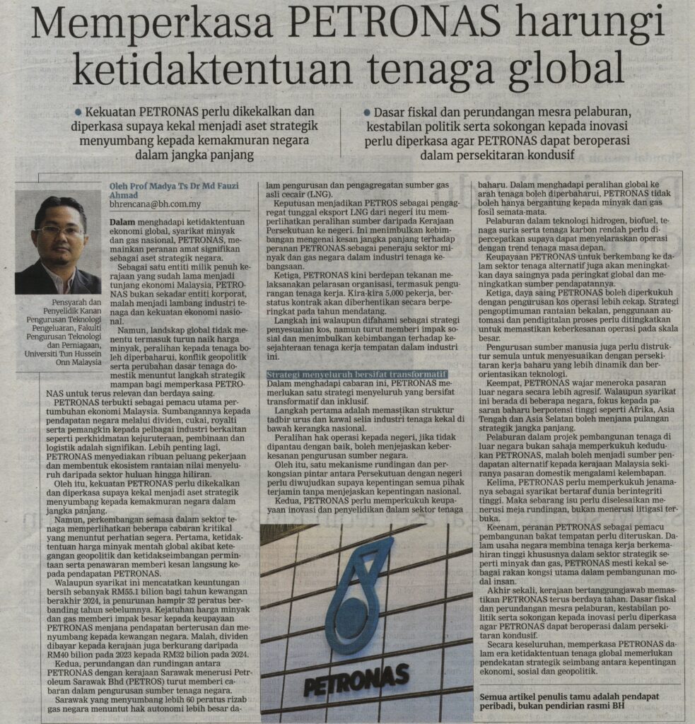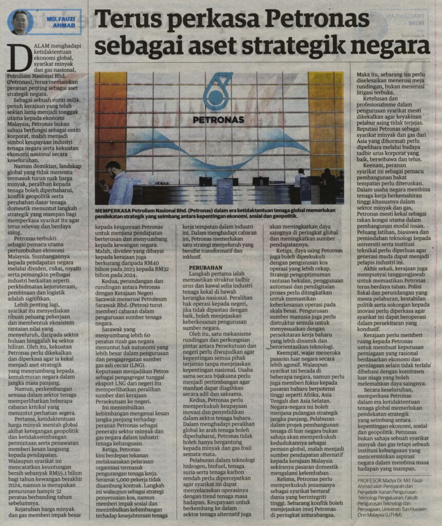 3. Utusan (utusan.com.my): Terus perkasa Petronas sebagai aset strategik negara oleh Prof. Madya Ts. Dr. Md Fauzi Ahmad, Fakulti Pengurusan Teknologi dan Perniagaan (FPTP), UTHM