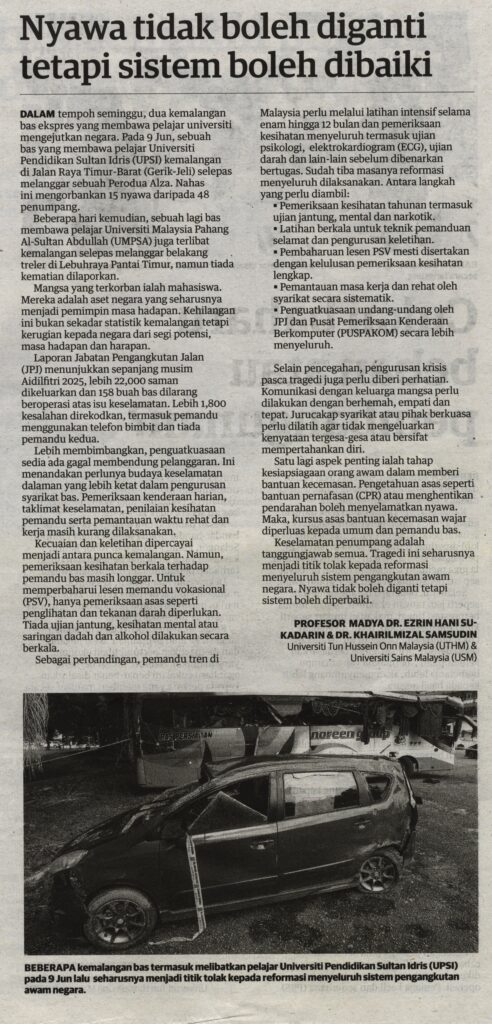 Kedua, insiden ini mendedahkan satu lagi penambahbaikan, iaitu tahap kesiapsiagaan orang awam dalam memberi bantuan kecemasan. Dalam situasi kemalangan di lokasi terpencil seperti di laluan Gerik-Jeli, orang awam yang berada di tempat kejadian adalah barisan hadapan sebelum ketibaan ambulans. “Tempoh keemasan” atau golden hour selepas kemalangan adalah sangat kritikal. Pengetahuan asas seperti Bantuan Pernafasan (CPR) dan cara menghentikan pendarahan boleh menjadi penentu antara hidup dan mati. Mungkin sudah sampai masanya modul bantuan kecemasan asas ini diintegrasikan secara lebih meluas, bukan sahaja untuk pemandu tetapi juga dalam kursus mandatori lain atau kempen kesedaran awam yang perlu dianjurkan. Keselamatan bukan sesuatu yang boleh dirunding. Setiap penumpang yang menaiki bas meletakkan nyawanya di tangan pemandu. Dan jika kita benar-benar serius mahu mengelakkan kemalangan seperti yang menimpa pelajar UPSI dan UMPSA berulang, maka sudah tiba masanya kita mengiktiraf bahawa tugas memandu bas bukan hanya sekadar kerja rutin malah ia adalah pekerjaan berisiko tinggi, yang memerlukan ketahanan fizikal dan mental yang kukuh, serta sistem sokongan yang mantap.