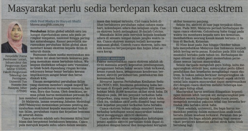 1. Berita Harian (muka surat: 11): Masyarakat perlu sedia berdepan kesan cuaca esktrem oleh Prof. Madya Dr. Haryati Shafii, Fakulti Pengurusan Teknologi dan Perniagaan (FPTP), UTHM