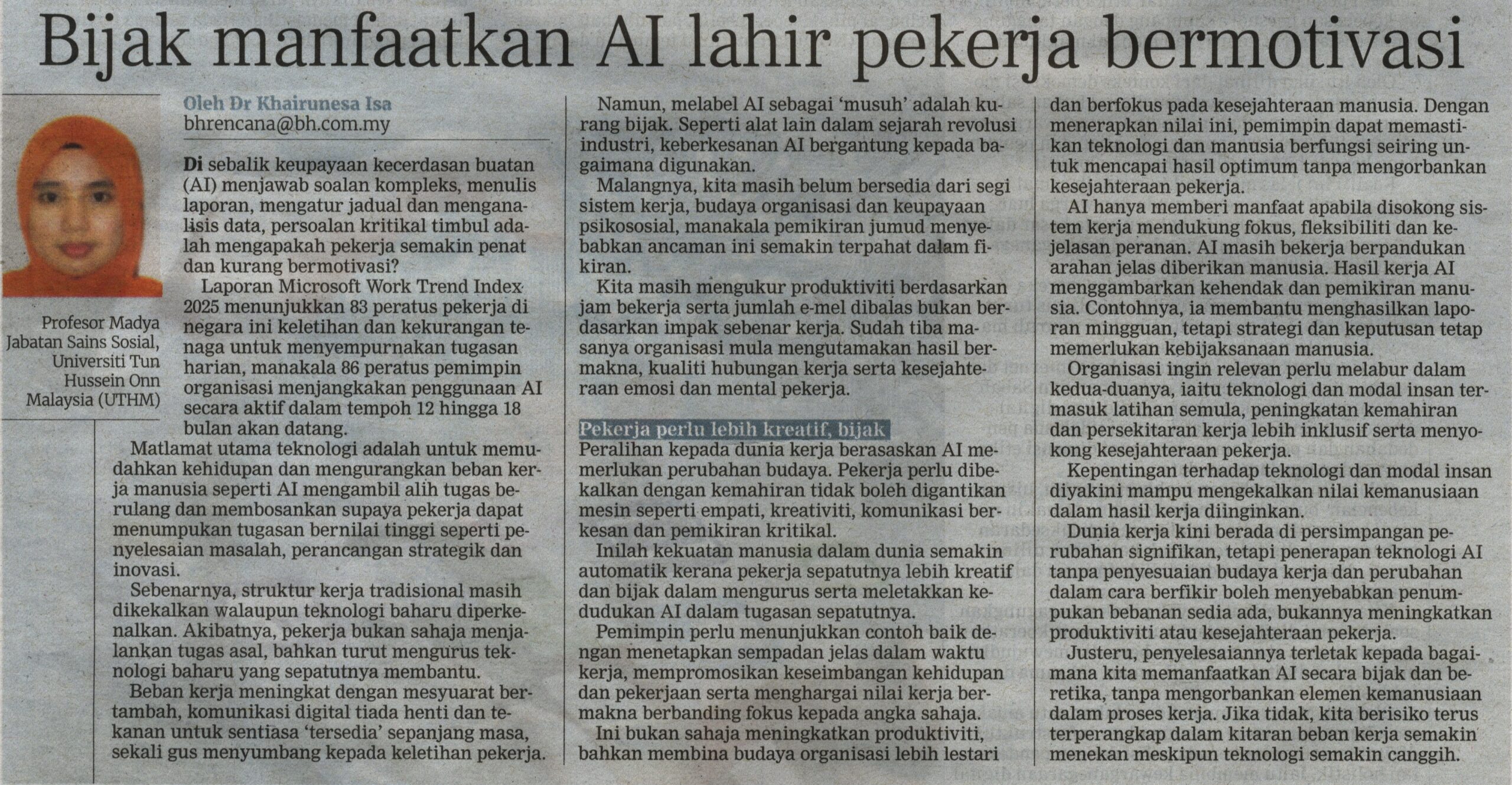 2. Berita Harian (bharian.com.my): Bijak manfaatkan AI lahir pekerja bermotivasi oleh Prof. Madya Dr. Khairunesa Isa, Pusat Pengajian Umum dan Kokurikulum (PPUK), UTHM