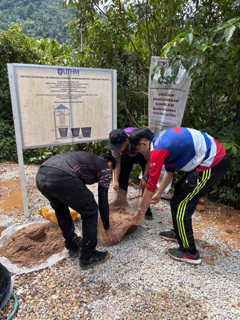 Melalui tajaan dana yang diperoleh daripada Yayasan UTHM, dengan kerjasama Pejabat Kampus Lestari (SCO), beberapa aktiviti telah dijalankan seperti kerja-kerja pembersihan tangki penapisan air, penggantian lapisan batu penapis, penukaran jaring dawai lama kepada yang baharu dan gotong-royong membersihkan kawasan sekitar.