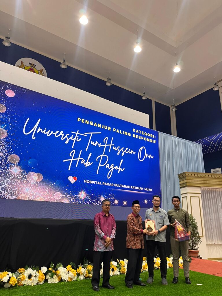 BATU PAHAT, 1 Julai 2025 – Universiti Tun Hussein Onn Malaysia (UTHM) melalui Kolej Kediaman Kampus Pagoh (KKKP) sekali lagi mencipta sejarah apabila menerima penghargaan sebagai ‘Penganjur Paling Responsif’ sempena sambutan Hari Penderma Darah Sedunia 2025 Peringkat Negeri Johor.