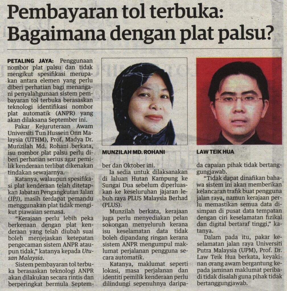 2. Utusan (utusan.com.my): Pembayaran tol terbuka: Bagaimana dengan plat palsu?. Kenyataan daripada Prof. Madya Dr. Munzilah Md. Rohani, Fakulti Kejuruteraan Awam dan Alam Bina (FKAAB), UTHM