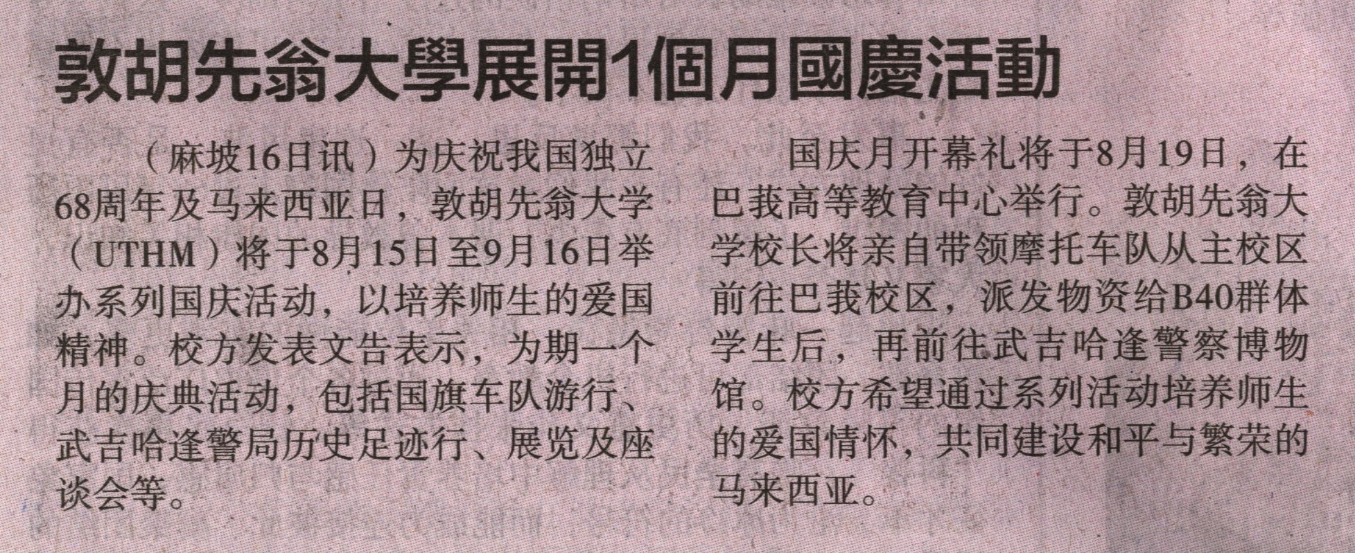 5. Sin Chew Daily (Johor) (page: 4): University Tun Hussein Onn Launches One-Month National Day Celebration