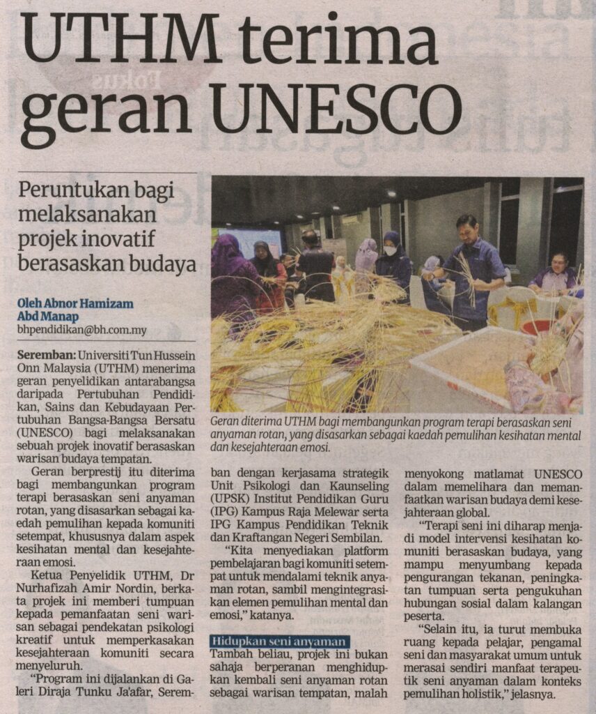 1. Berita Harian (muka surat: 26): UTHM terima geran UNESCO