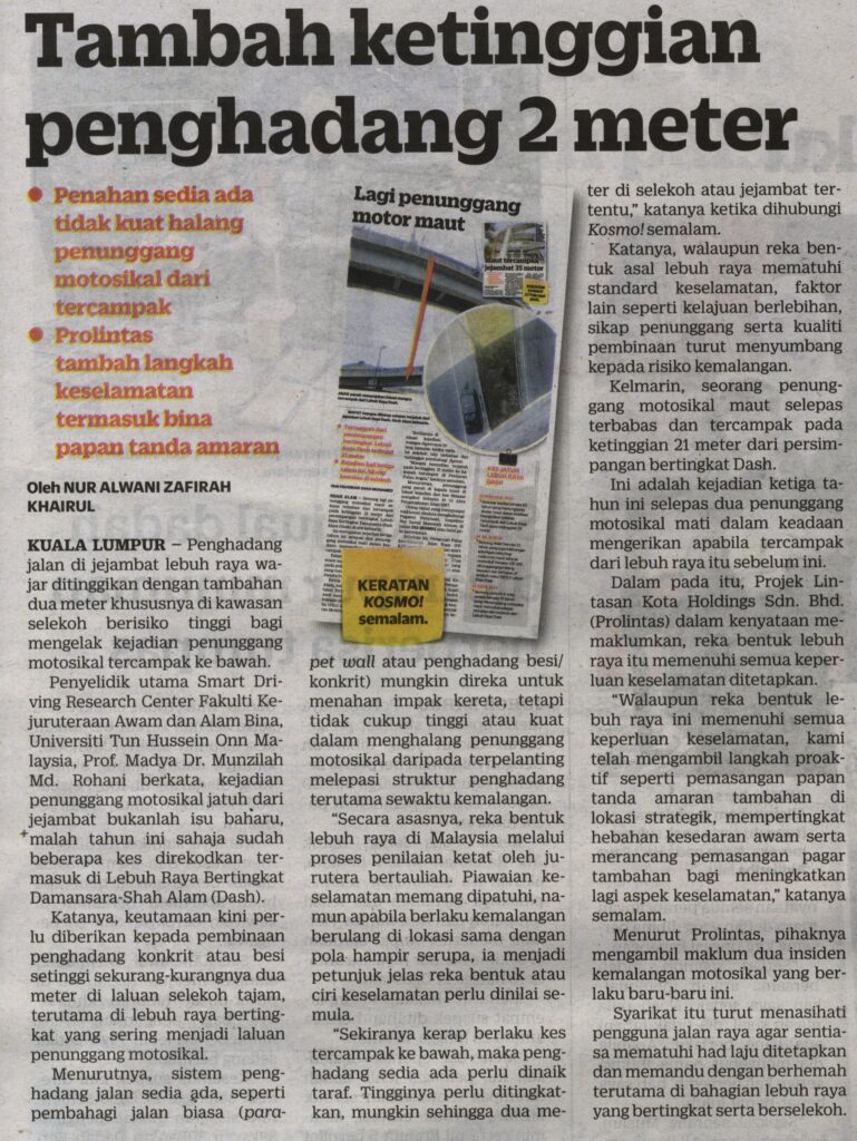 4. Kosmo (kosmo.com.my): Tambah ketinggian penghadang 2 meter. Kenyataan daripada Prof. Madya Dr. Munzilah Md. Rohani, Fakulti Kejuruteraan Awam dan Alam Bina (FKAAB), UTHM