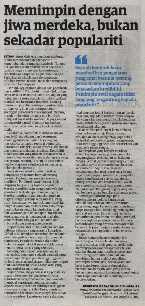 2. Utusan (utusan.com.my): Memimpin dengan jiwa merdeka, bukan sekadar populariti oleh Prof. Madya Dr. Khairunesa Isa, Pusat Pengajian Umum dan Kokurikulum (PPUK), UTHM
