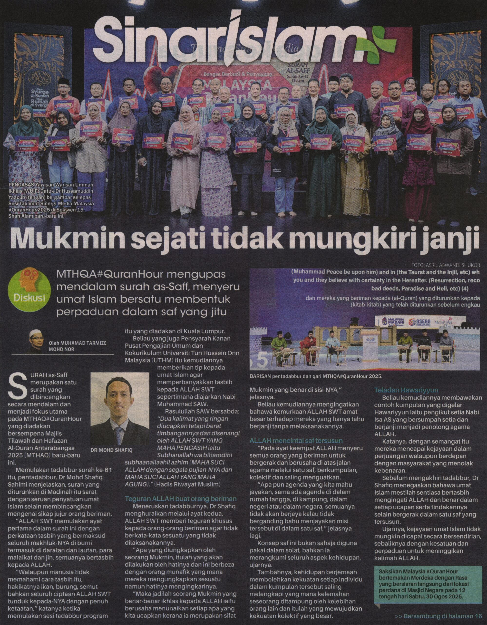 2. Sinar Harian (sinarharian.com.my): Mukmin sejati tidak mungkiri janji. Kenyataan daripada Dr. Mohd Shafiq Sahimi, Pusat Pengajian Umum dan Kokurikulum (PPUK)