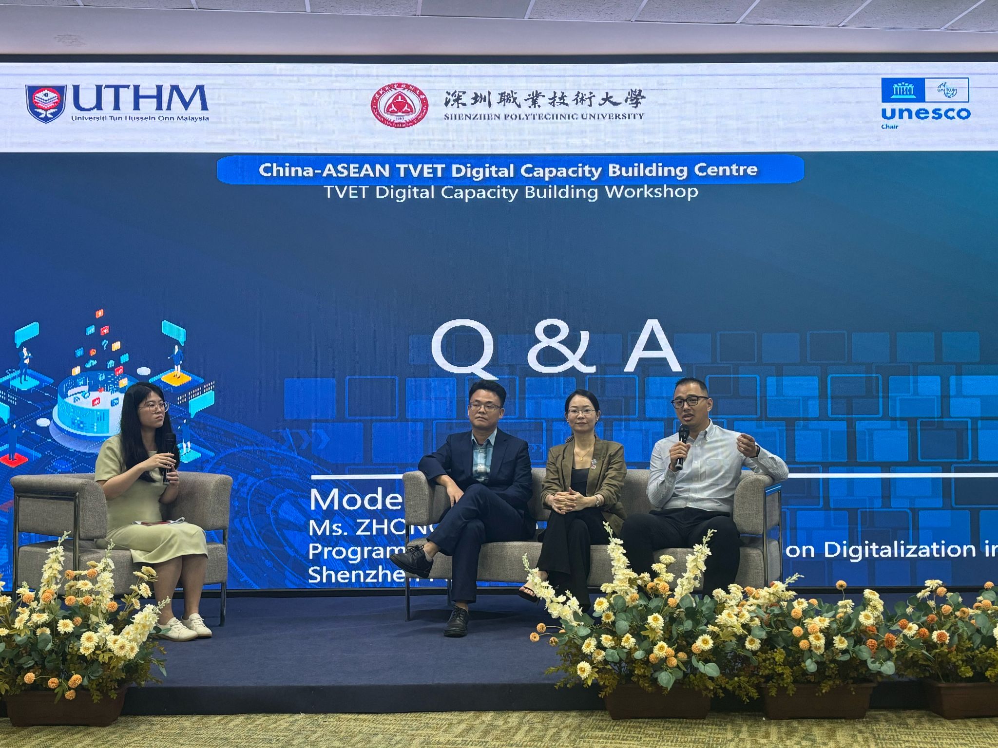 Untuk memudahkan penubuhan pusat tersebut, satu delegasi SZPU yang diketuai oleh Dr. YANG Congkun, koordinator UNESCO Chair on Digitalization in TVET-SZPU, bersama delegasi Dr ZENG Xiuzhen, Ms. ZHONG Zhuoya, Dr. QU Haizhou, dan Dr. WU Qingtian, menghadiri majlis perasmian dan Bengkel Pembinaan Kapasiti Digital TVET di UTHM.