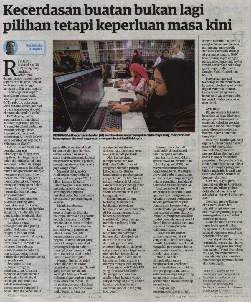 2. Utusan (utusan.com.my): Kecerdasan buatan bukan lagi pilihan tetapi keperluan masa kini oleh Prof. Madya Ts. Dr. Md Fauzi Ahmad, Fakulti Pengurusan Teknologi dan Perniagaan (FPTP), UTHM