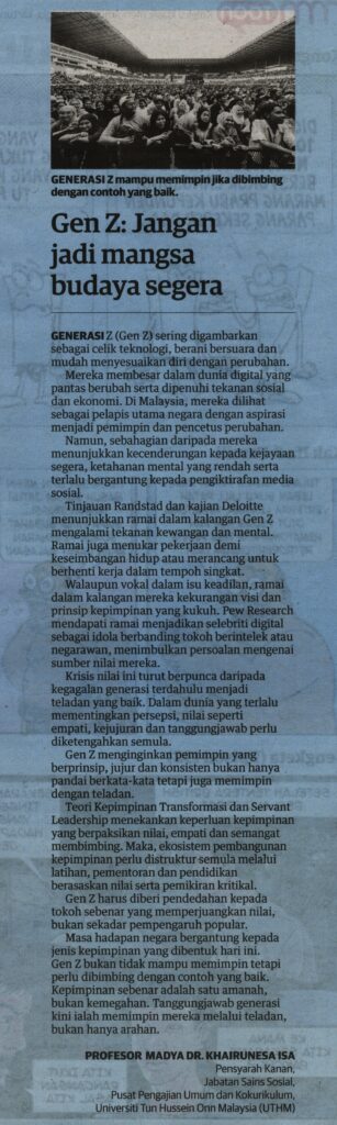 1. Utusan Malaysia (muka surat: 31), 6 September 2025: Gen Z: Jangan jadi mangsa budaya segera