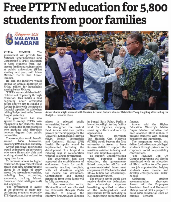 13. Borneo Post (Kuching) (page: 4): Free PTPTN education for 5,800 students from poor families