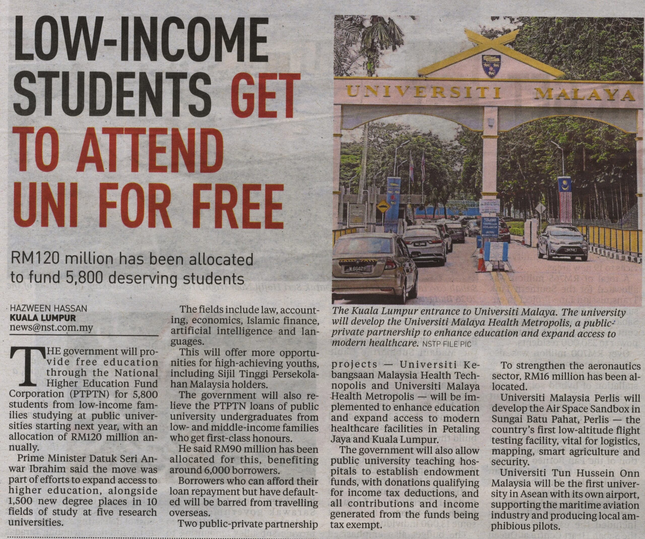 11. New Straits Times (page: 8): LOW-INCOME STUDENTS GET TO ATTEND UNI FOR FREE