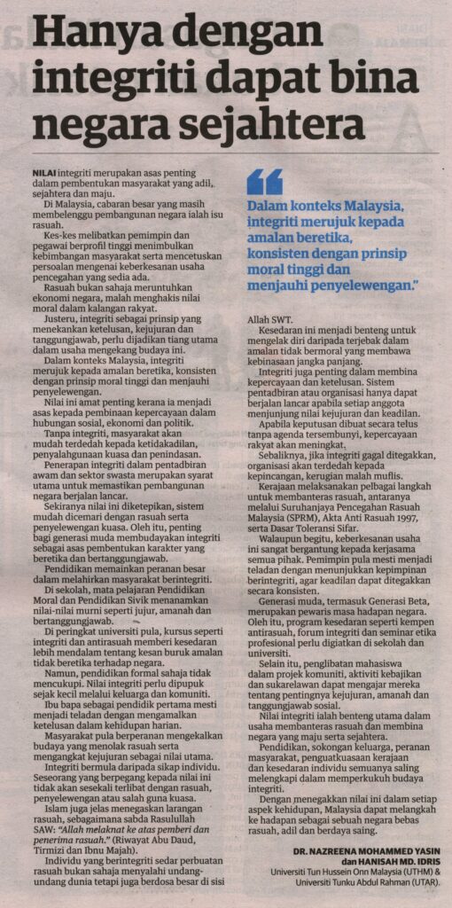 8. Utusan (utusan.com.my): Hanya dengan integriti dapat bina negara sejahtera oleh Dr. Nazreena Mohammed Yasin, Pusat Pengajian Umum dan Kokurikulum (PPUK), UTHM dan Hanisah Md. Idris, Universiti Tunku Abdul Rahman (UTAR)