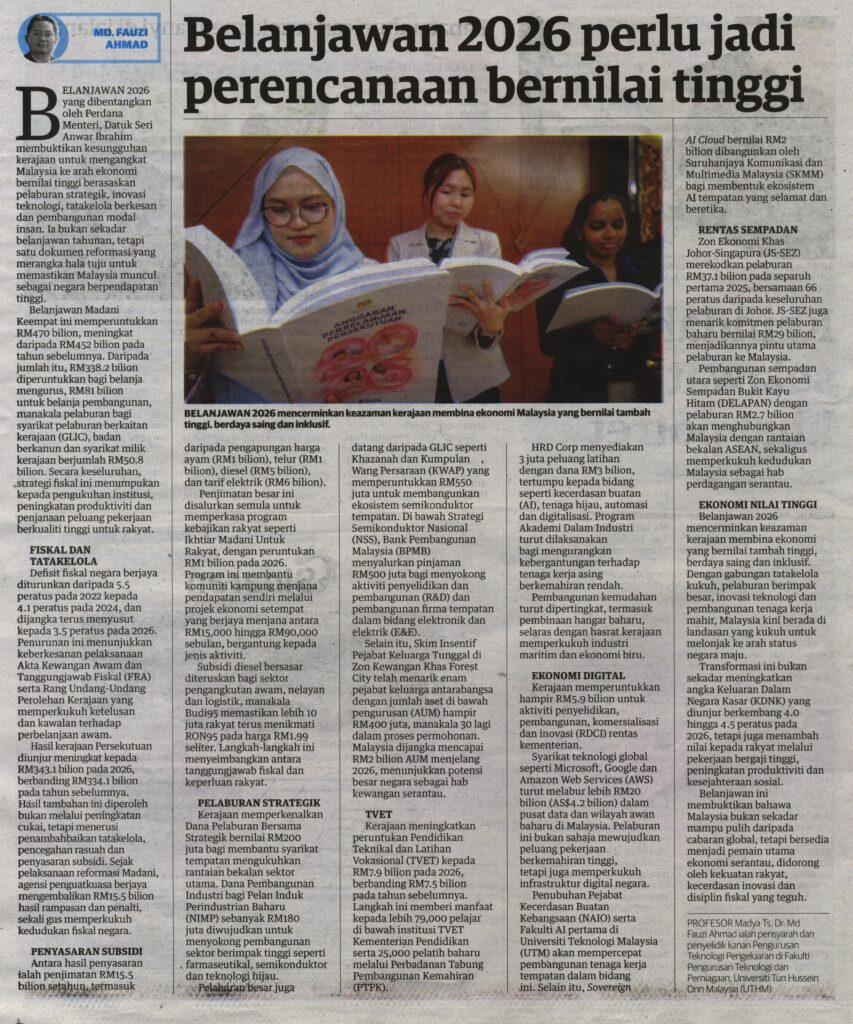2. Utusan (utusan.com.my): Belanjawan 2026 perlu jadi perencanaan bernilai tinggi oleh Prof. Madya Ts. Dr. Md Fauzi Ahmad, Fakulti Pengurusan Teknologi dan Perniagaan (FPTP), UTHM