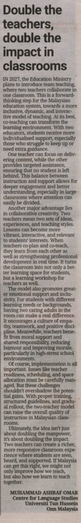 8. The Star Malaysia (thestar.com.my): Double the teachers, double the impact in classrooms by Muhammad Ashraf Omar, Centre for Language Studies (CLS), UTHM