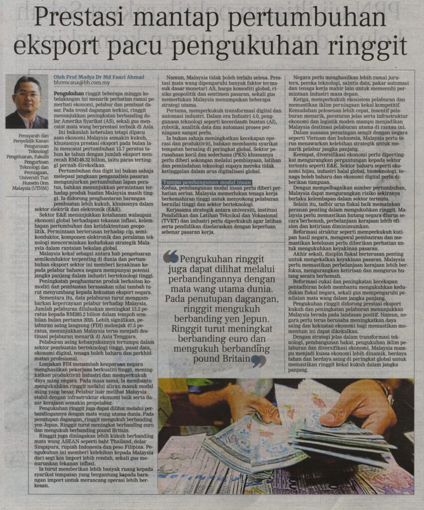 2. Berita Harian (bharian.com.my): Prestasi mantap pertumbuhan eksport pacu pengukuhan ringgit oleh Prof. Madya Ts. Dr. Md Fauzi Ahmad, Fakulti Pengurusan Teknologi dan Perniagaan (FPTP), UTHM