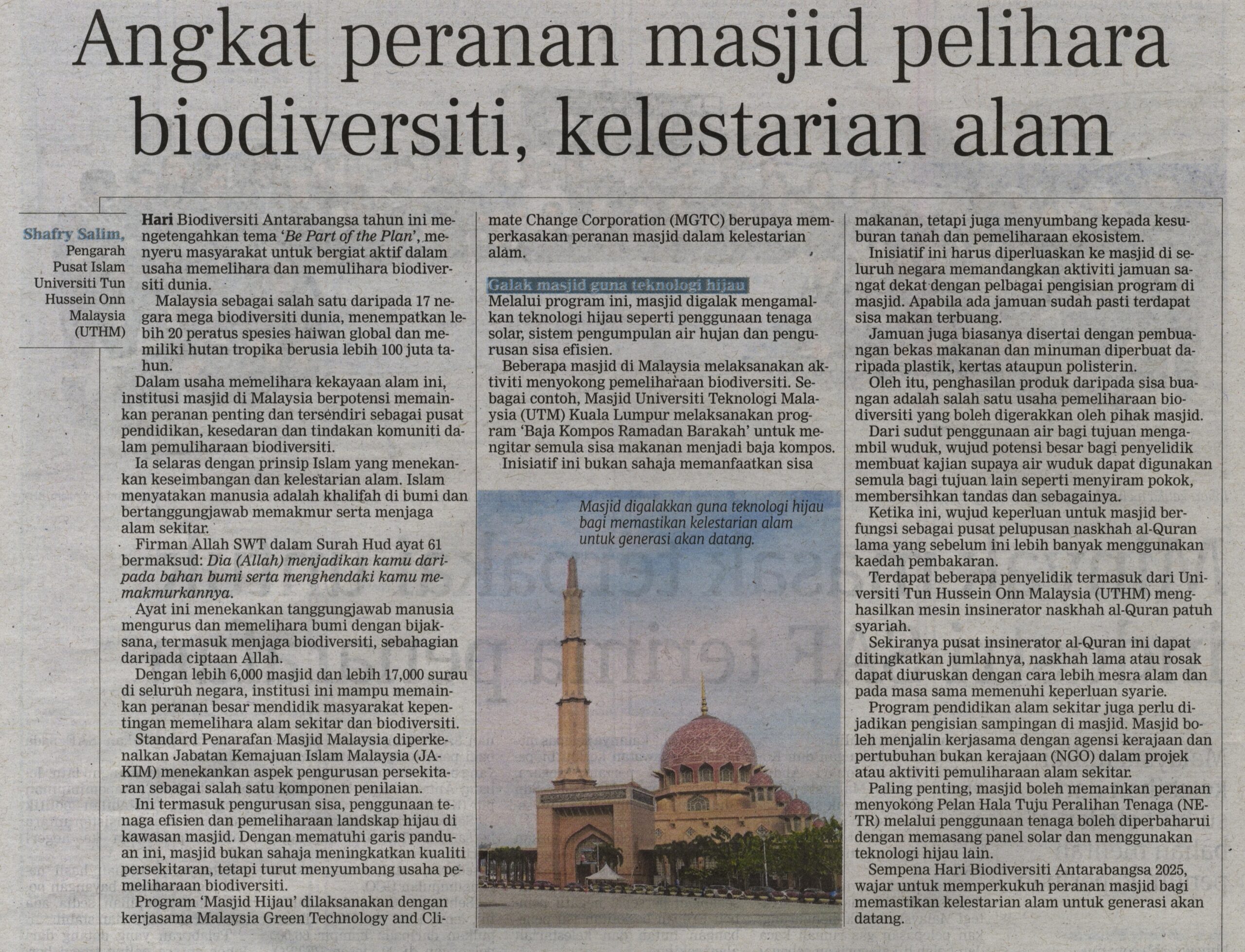 3. Berita Harian (muka surat: 13): Angkat peranan masjid pelihara biodiversiti, kelestarian alam oleh Shafry Salim, Pengarah Pusat Islam, UTHM