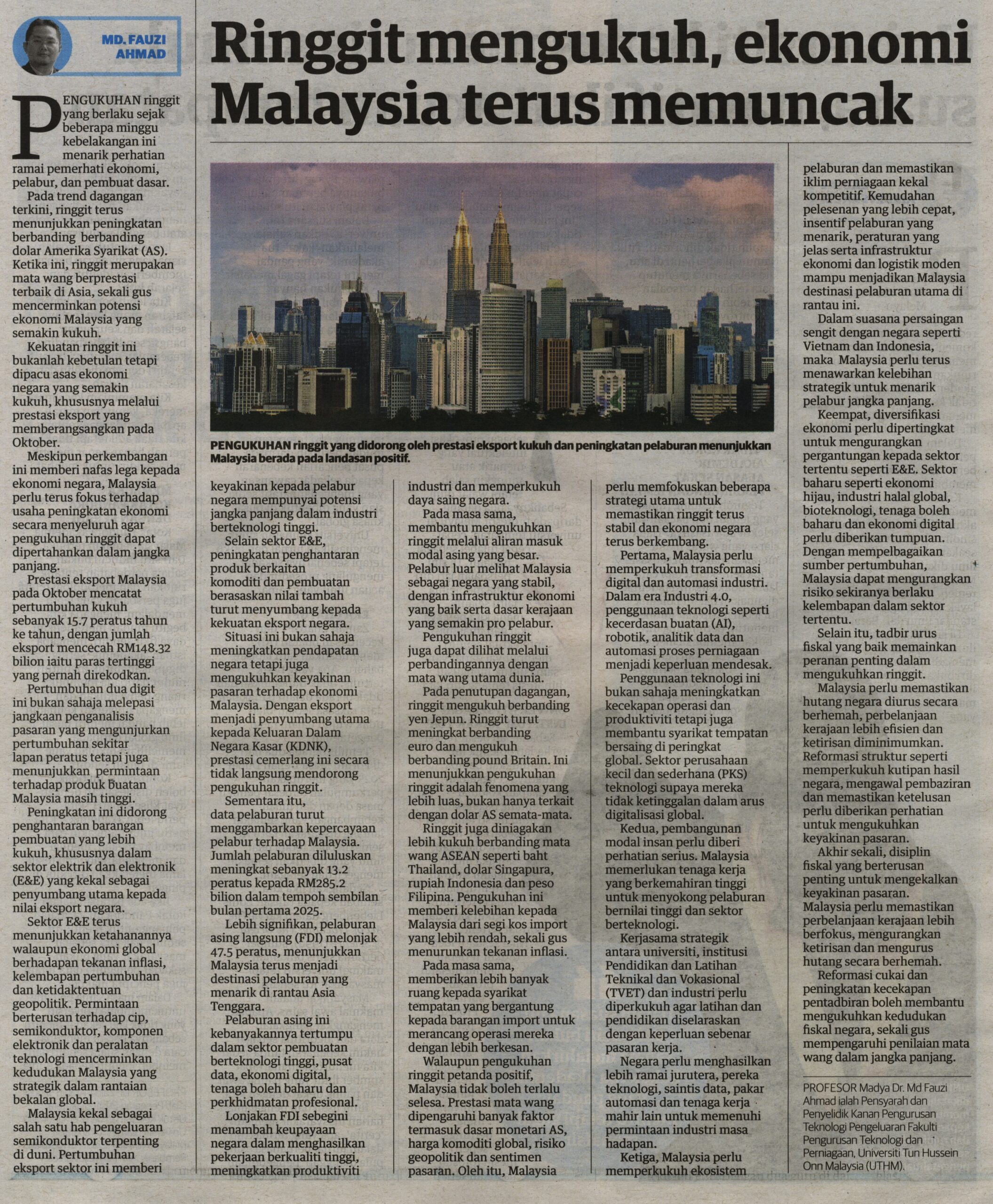2. Utusan (utusan.com.my): Ringgit mengukuh, ekonomi Malaysia terus memuncak oleh Prof. Madya Ts. Dr. Md Fauzi Ahmad, Fakulti Pengurusan Teknologi dan Perniagaan (FPTP), UTHM