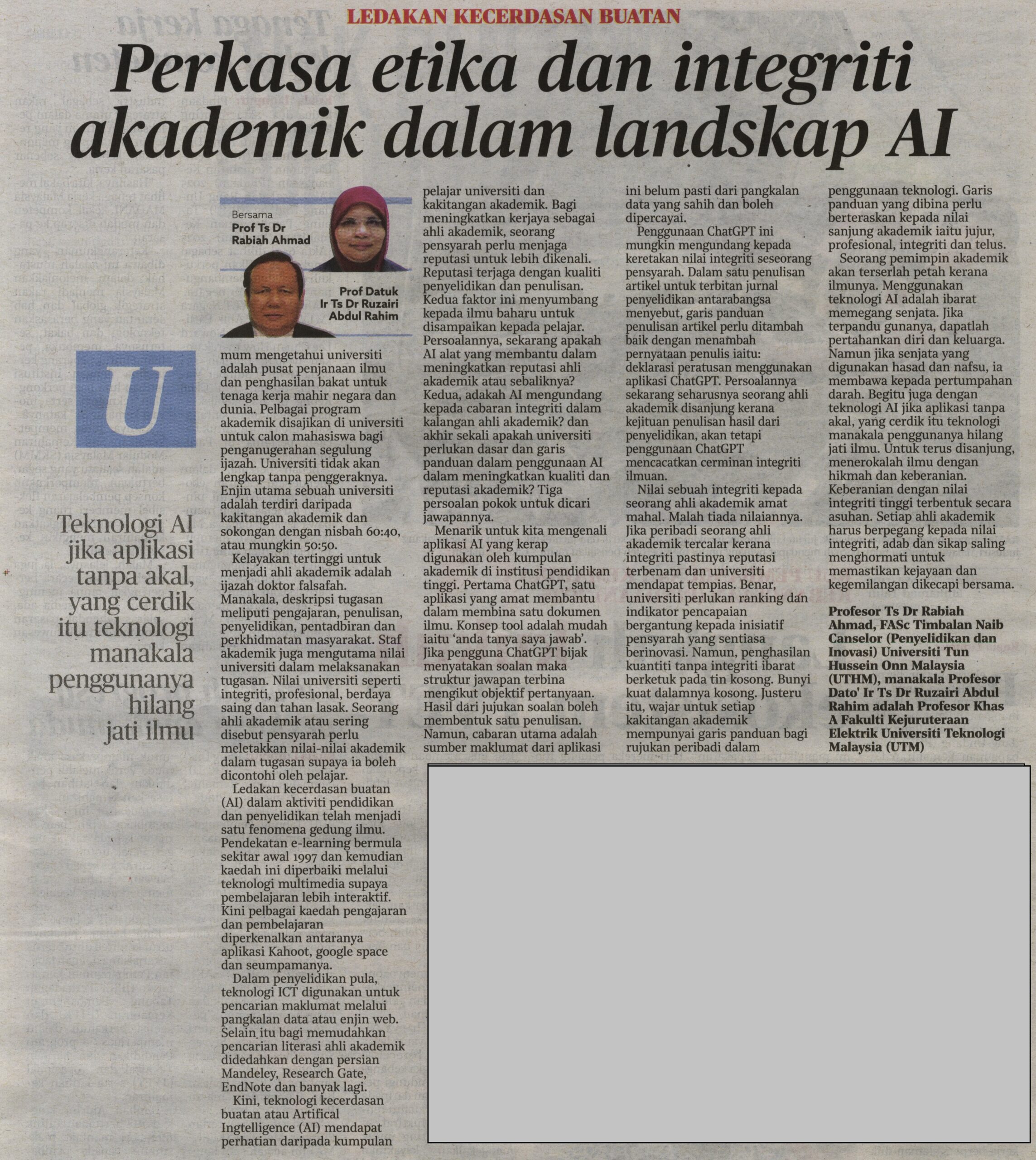 Kini teknologi kecerdasan buatan atau Artifical Ingtelligence (AI) mendapat perhatian daripada kumpulan pelajar universiti dan kakitangan akademik. Bagi meningkatkan kerjaya sebagai ahli akademik, seorang pensyarah perlu menjaga reputasi untuk lebih dikenali. Reputasi terjaga dengan kualiti penyelidikan dan penulisan. Kedua faktor ini menyumbang kepada ilmu baharu untuk disampaikan kepada pelajar. Persoalannya sekarang apakah AI alat yang membantu dalam meningkatkan reputasi ahli akademik atau sebaliknya?. Kedua, adakah AI mengundang kepada cabaran integriti dalam kalangan ahli akademik? ..dan akhir sekali apakah universiti perlukan dasar dan garis panduan dalam penggunaan AI dalam meningkatkan kualiti dan reputasi akademik? Tiga persoalan pokok untuk dicari jawapannya.