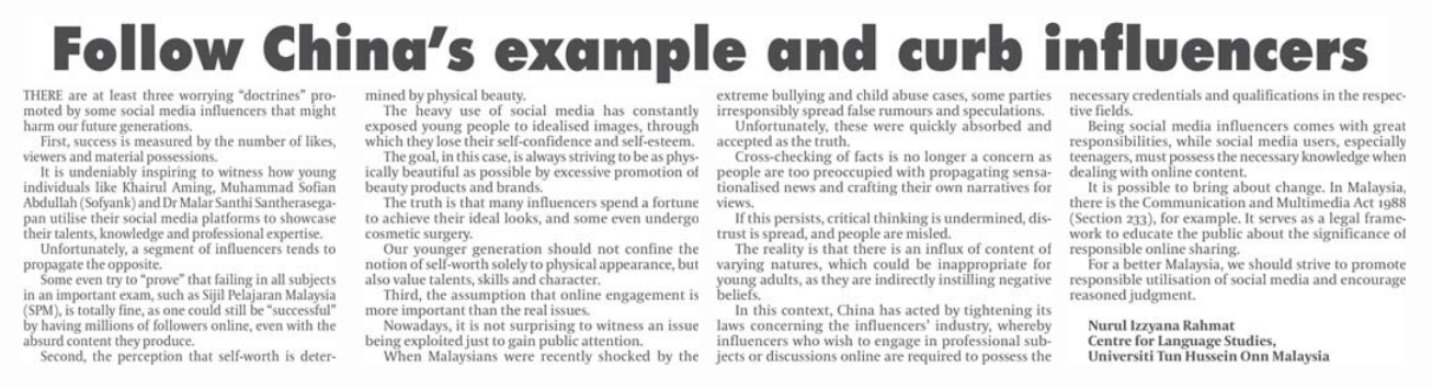 4. Daily Express (dailyexpress.com.my): Follow China’s example and curb influencers by Nurul Izzyana Rahmat, Centre for Language Studies (CLS), UTHM