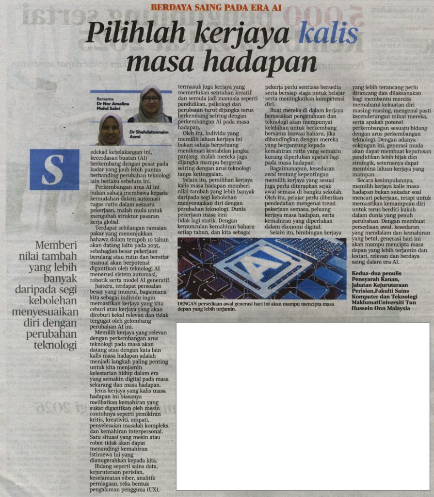 4. MyMetro (hmetro.com.my): Pilihlah kerjaya kalis masa hadapan oleh Dr. Nor Amalina Mohd Sabri dan Dr. Shahdatunnaim Azmi, Fakulti Sains Komputer dan Teknologi Maklumat (FSKTM), UTHM