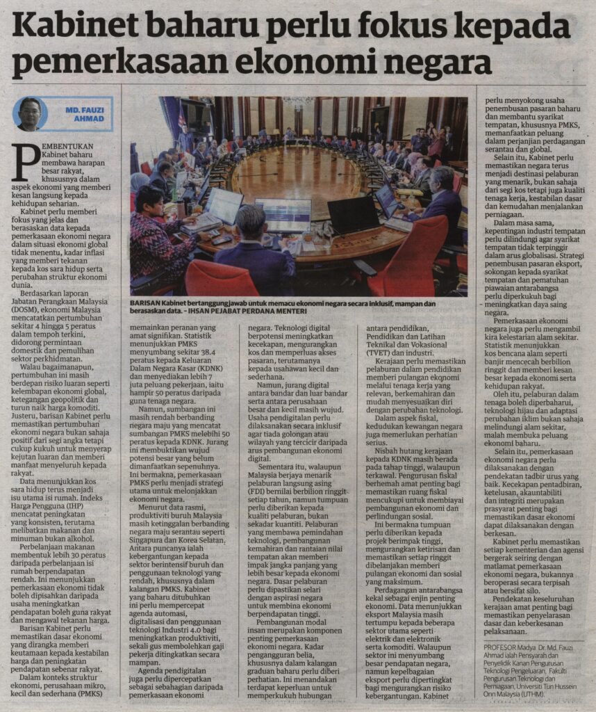 2. Utusan (utusan.com.my): Kabinet baharu perlu fokus kepada pemerkasaan ekonomi negara oleh Prof. Madya Ts. Dr. Md Fauzi Ahmad, Fakulti Pengurusan Teknologi dan Perniagaan (FPTP), UTHM