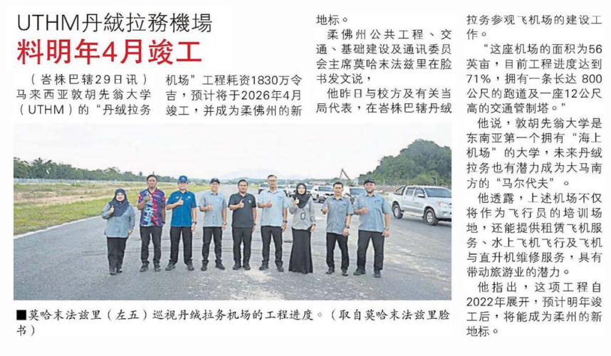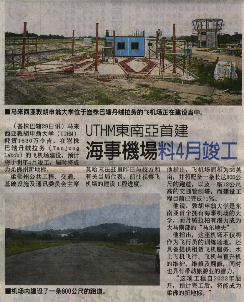 10. China Press (Johor) (page: C3): UTHM东南亚首建海事机场 预计4月竣工