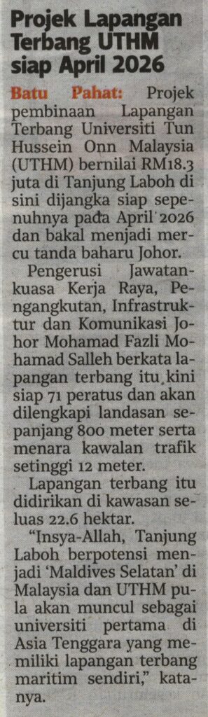 3. Harian Metro (muka surat: 4): Projek Lapangan Terbang UTHM siap April 2026