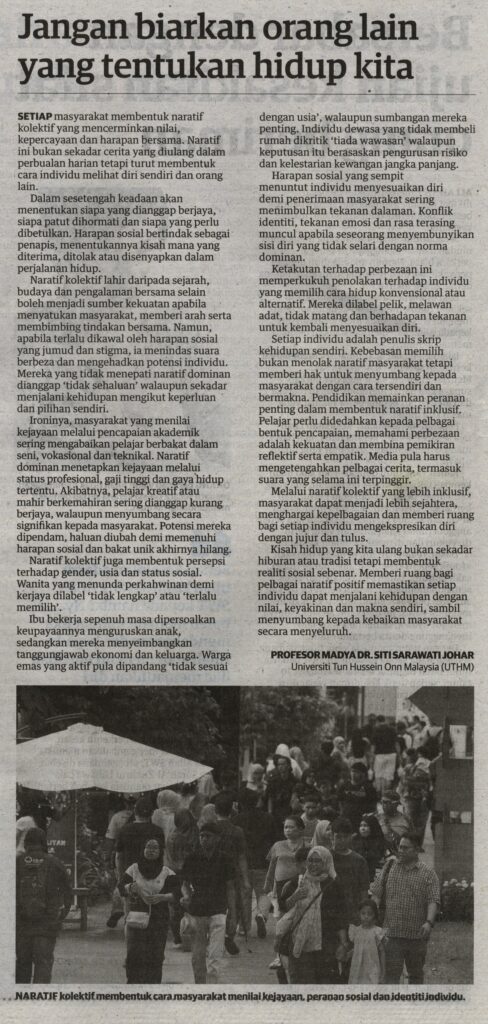 2. Utusan (utusan.com.my): Jangan biarkan orang lain yang tentukan hidup kita oleh Prof. Madya Dr. Siti Sarawati Johar, Pusat Pengajian Umum dan Kokurikulum (PPUK), UTHM