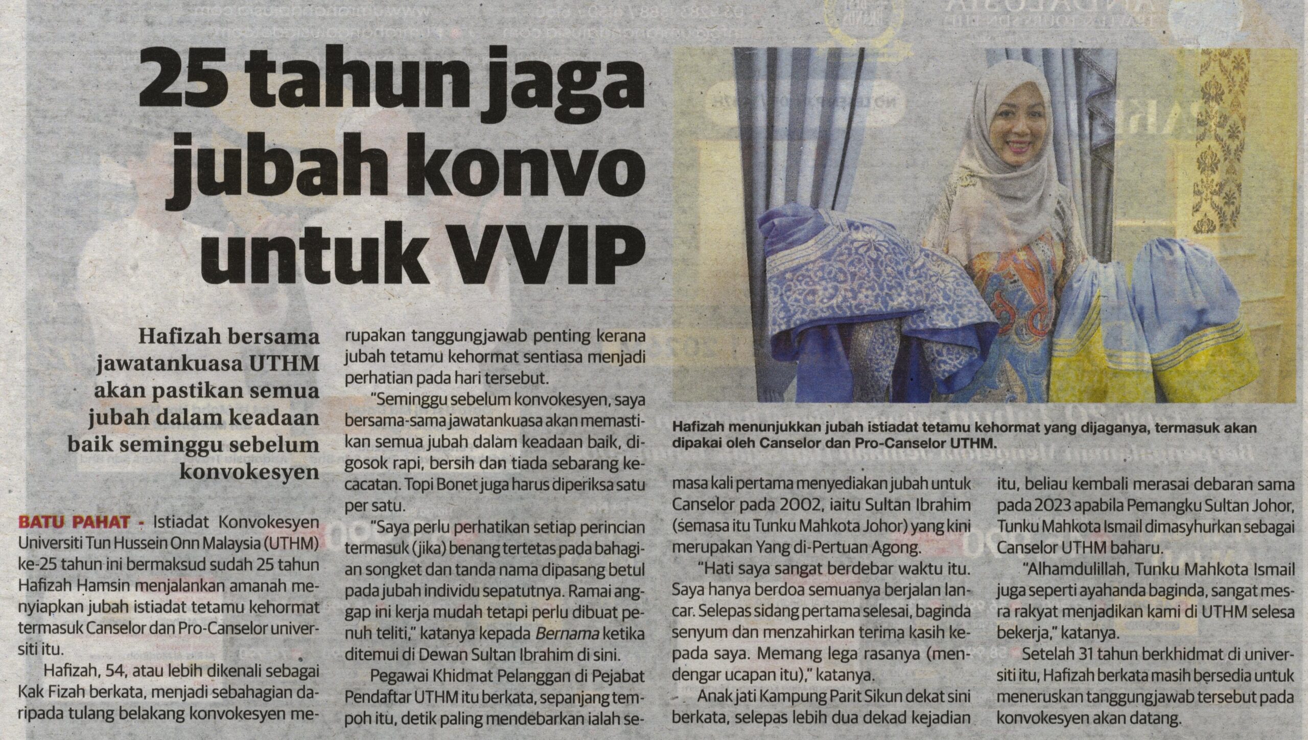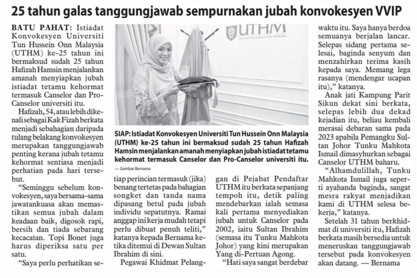 10. Bernama (bernama.com): 25 Years Of Dedication: Kak Fizah’s Unseen Role In Preparing UTHM VVIP Robes