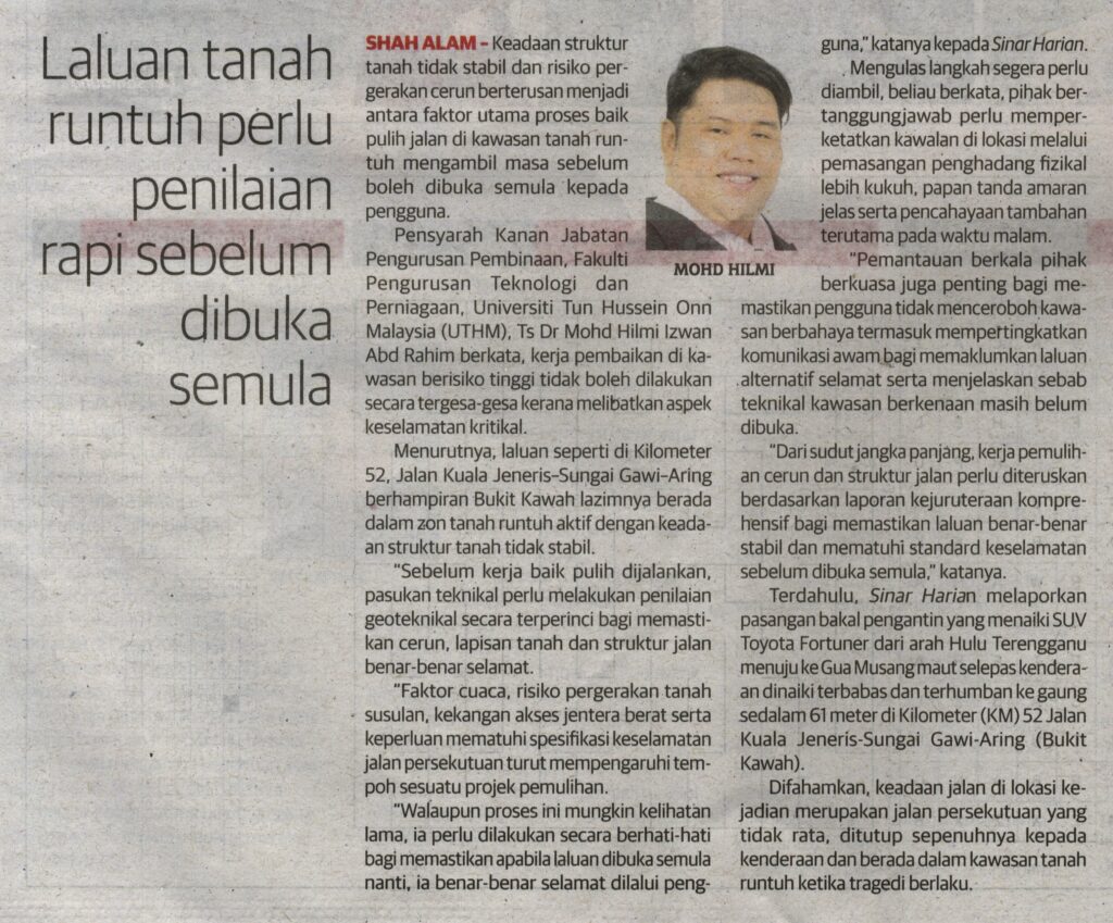 3. Sinar Harian (muka surat: 20): Laluan tanah runtuh perlu penilaian rapi sebelum dibuka semula. Kenyataan daripada Ts. Dr. Mohd Hilmi Izwan Abd Rahim, Fakulti Pengurusan Teknologi dan Perniagaan (FPTP), UTHM