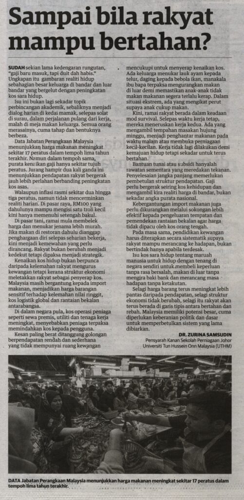2. Utusan (utusan.com.my): Sampai bila rakyat mampu bertahan? oleh Dr. Zurina Samsudin, Johor Business School (JBS), UTHM