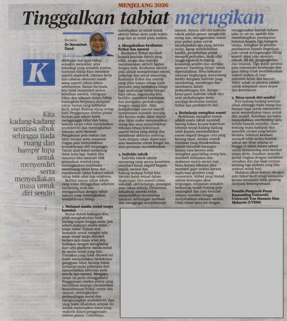 Kehidupan dan gaya hidup semakin mencabar, arus teknologi yang semakin pantas, tuntutan hidup yang semakin menekan seperti akademik, tekanan kerja dan cabaran ekonomi masih sama seperti tahun-tahun sebelumnya. Ramai daripada kita tidak menyedari bahawa punca keletihan mental, hilangnya fokus dan tekanan dalam hidup kadang kala berpunca daripada tabiat harian yang kelihatannya kecil tetapi diulang-ulang setiap hari. Penggunaan telefon pintar berjam-jam sehari boleh mengganggu tidur dan fokus, bekerja tanpa rehat menjejaskan produktiviti dan meningkatkan tekanan serta burnout. Manakala pengabaian pola makan dan tidur yang teratur serta senaman ringan menyebabkan kesejahteraan diri terganggu. Tahun 2026 bakal menjelang tidak lama lagi. Sudah tiba masanya untuk kita mencari titik permulaan mental yang meningkatkan komitmen kita untuk membuang tabiat lama dan membentuk tabiat baharu untuk hidup yang lebih sihat dan sejahtera.