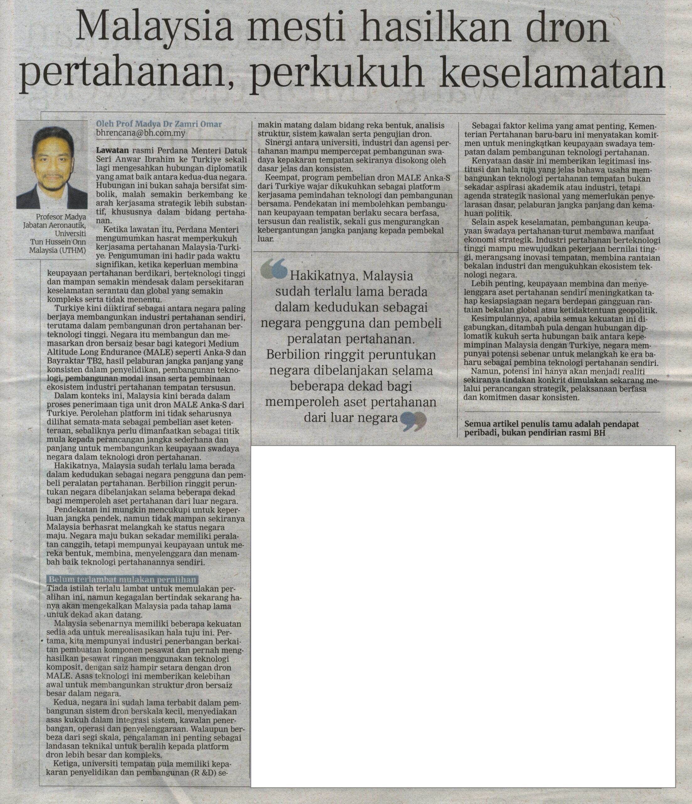 1. Berita Harian Ahad (muka surat: 11): Malaysia mesti hasilkan dron pertahanan, perkukuh keselamatan oleh Prof. Madya Dr. Zamri Omar, Fakulti Kejuruteraan Mekanikal dan Pembuatan (FKMP), UTHM